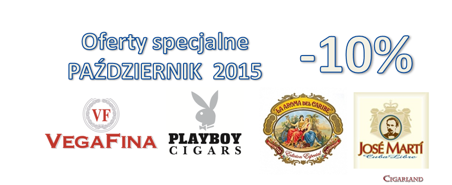 Jedynie do końca października 2015 r. (lub wyczerpania zapasów) cygara marek: VegaFina, Playboy, La Aroma Del Caribe, Jose Marti - 10% taniej! Tylko w Cigarland.pl.